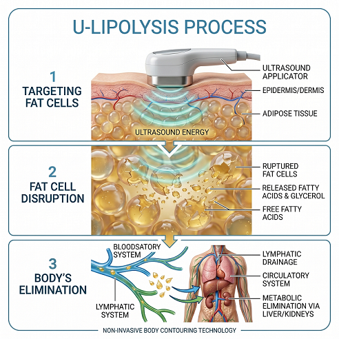 U-Lipolysis, also known as ultrasound lipolysis, is a non-invasive fat reduction treatment that uses ultrasonic waves to break down fat cells beneath the skin. These fat cells are then naturally eliminated by the body over time.